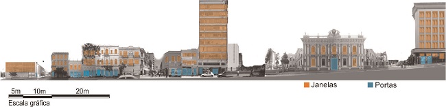 Sobre a "análise da constitutividade" (Figura 6), percebe-se as aberturas características das cidades luso-brasileiras, semelhante às analises realizadas em Laguna e São Francisco do Sul. Há uma grande quantidade de portas e janelas, que garantem a relação entre interior e exterior das construções. Entretanto, observa-se uma alteração na cadência do ritmo, criada pelos grandes portões metálicos no térreo de algumas lojas.