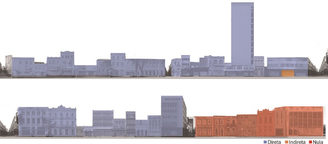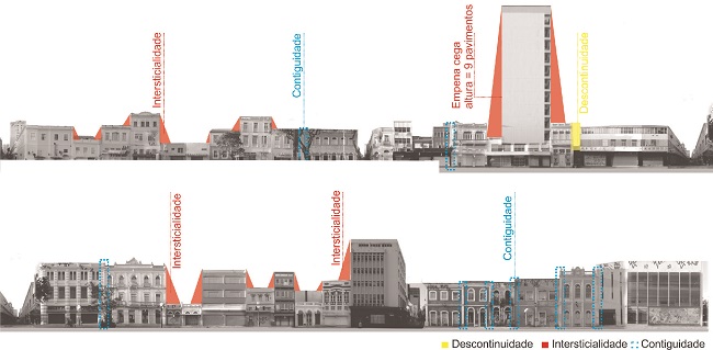 Uma característica interessante do conjunto edificado, apresentada na "análise da relação entre espaço público e edificado" (Figura 8) é a ausência de recuo lateral, que garante as relações de contiguidade entre as construções e mantém as propriedades dos gabaritos.