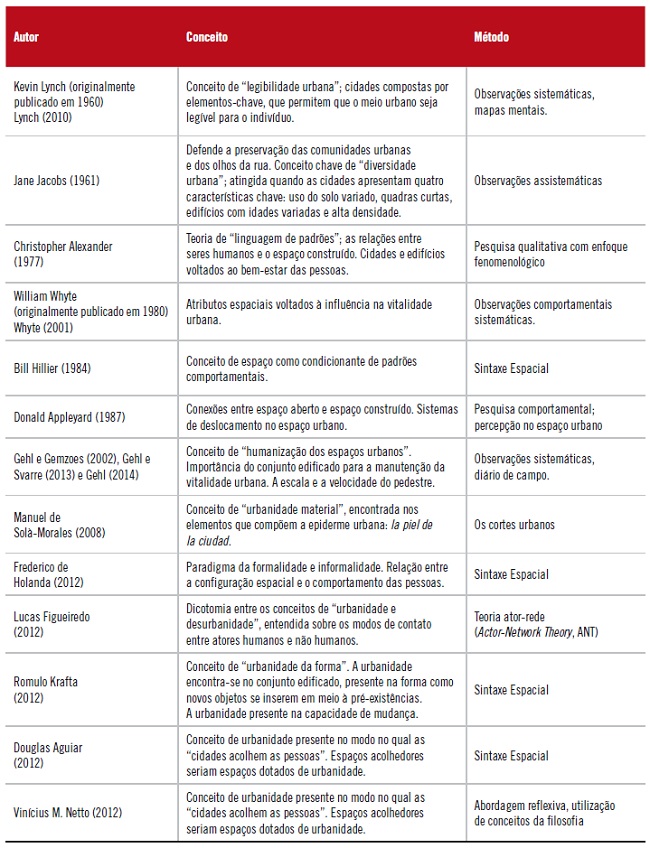 A relação entre morfologia e uso do espaço é um fator-chave para a determinação das características de urbanidade, conforme pode ser visto por meio do quadro síntese (Quadro 1), essa questão é abordada por vários dos autores relacionados ao tema.