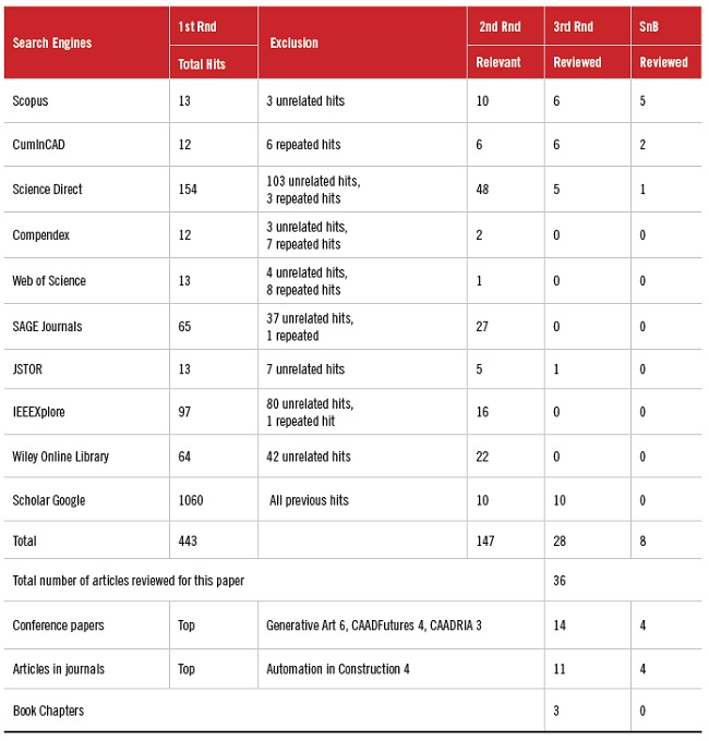 This SML used a Boolean search for the following terms and connectors organized in the form of the following string: “cellular automata” AND “design process” AND (architecture* OR urban*). The SML was divided into three search rounds. Firstly, the Boolean search was undertaken in 9 search engine indexes: Scopus, CumInCAD, Science Direct, Compendex, Web of Science, Sage Journals, JSTOR, IEEEXplore, and Wiley Online Library. This search generated 444 hits. Secondly, the hits from the first round were manually selected, based on the titles and abstracts, as to whether they were related to the fields of Architecture and Urban Studies, generating 137 hits. Grey literature, indexes, summaries, book reviews, citations, and patents were all excluded. In the third-round, papers were skimmed through to see if they actually fit the SML criteria and had usable examples of applications of CA in the design process (Table 1). References from these papers that contained the word “cellular automata” were also reviewed and, when applicable, were added to this research as snowballing results. Google scholar was searched for last and 10 relevant hits were added to the study. Figure I illustrates the distribution of the reviewed papers by year and type of publication showing a constant interest in the theme in the past decades with a recent increase.