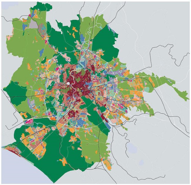 A partir da análise documental foi possível observar, conforme mencionado no tópico anterior, que na cidade de Roma, as regulamentações que controlam anúncios comerciais na paisagem urbana estão atreladas ao zoneamento estabelecido pelo Plano Regulador Geral, o qual divide o município em cinco zonas distintas, da cidade histórica ao território não urbanizado, apresentando paisagens bastante diversas. A cidade histórica, embora predomine na parte central do território, encontra-se também pulverizada pela periferia como pode ser observado no mapa da Figura 1.
