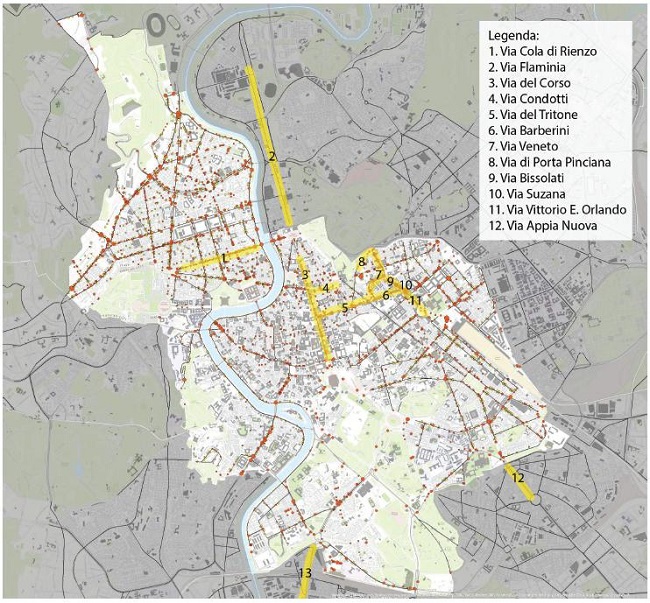 Assim, os recortes para estudo se caracterizaram pelas vias: Veneto, di Porta Pinciana, Bissolati, Barberini, Suzana, Vittorio E.Orlando (conjunto indicado pela norma 260 como área de interesse protetivo para o município junto com as praças Barberini e Reppublica), Via del Tritone, Via Condotti, Via del Corso, Via Cola di Rienzo (todas no Município I), Via Flaminia (no município II) e Via Ostiense (no Município VIII).