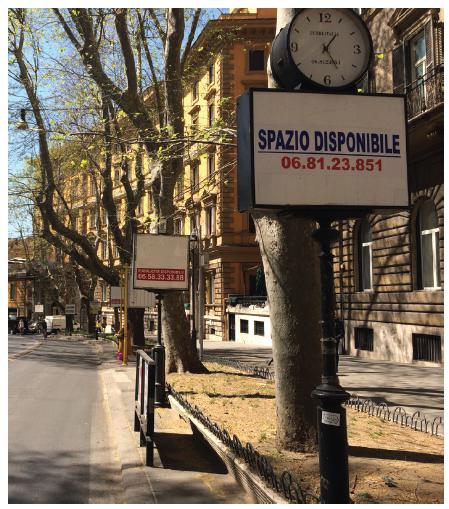 A Via Appia Nuova também apresenta calçadas estreitas e as instalações publicitárias tomam parte das calçadas prejudicando o deslocamento. No entanto, o fluxo de pedestres é menor que na Via del Corso. Os canteiros centrais da Via Appia Nuova, que concentram também estacionamentos públicos, apresentam as piores situações encontradas nos recortes desta pesquisa. Isso ocorre pela concentração de anúncios em espaço público e o distanciamento das peças, como é possível observar no Quadro 1 e na Figura 8.
