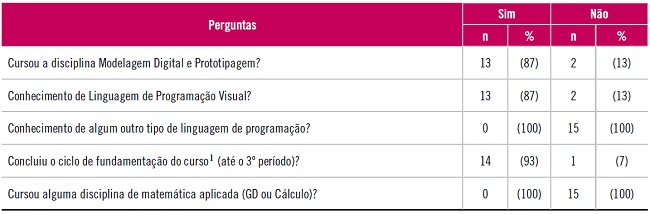 Nesse cenário, o workshop contou com a participação de dois tutores/professores e quinze alunos de graduação7 do curso de arquitetura e urbanismo em questão, que foram divididos em três equipes de cinco componentes. Não houve nenhum tipo de tutorial ou aula para realização das atividades do workshop, uma vez que se objetivava também verificar como os alunos utilizariam os conhecimentos adquiridos no curso para a elaboração das atividades. Dentre os quinze participantes do workshop, treze (o equivalente a 87%) já haviam cursado a disciplina MDP, enquanto dois (13%) ainda não haviam cursado a disciplina. Nenhum dos participantes possuía qualquer conhecimento prévio em algum outro tipo de linguagem de programação. A Tabela 1 traz informações sobre os participantes do workshop e seus respectivos repertórios em programação e Geometria.