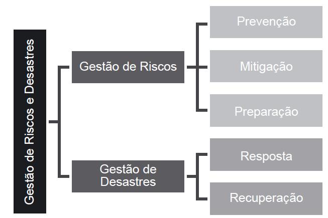 Para que isso ocorra, os governantes podem contar com a Gestão de Riscos e Desastres (GRD) para lhes auxiliar nas etapas de prevenção, mitigação, preparação, resposta e reconstrução (Figura 1).
