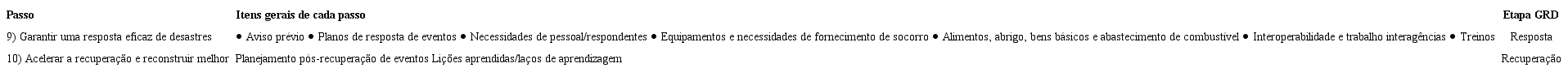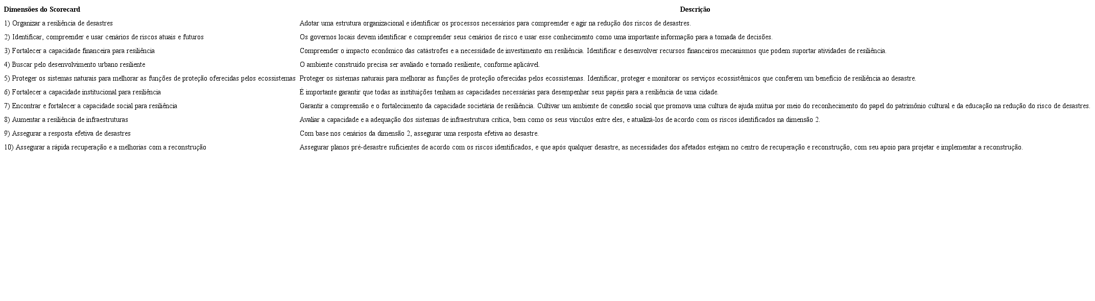 Com essa estrutura, o Scorecard auxilia os municípios a entenderem os riscos que correm e a conhecerem sua capacidade de mitigação e resposta frente aos desastres. Ele também permite análises de curto e longo prazo, considerando os impactos negativos perante as infraestruturas, o meio ambiente e a sociedade (UNITED NATIONS OFFICE FOR DISASTER RISK REDUCTION, 2017). No entanto, é possível observar que apenas as dimensões 9 e 10 correspondem às etapas de resposta e recuperação pós-desastre.