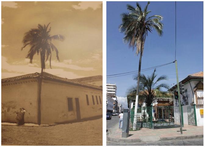 O percurso da cidade começa na esquina que serviu como parâmetro para o traçado da atual cidade de Ibarra, La Esquina del Coco. Como foi descrito anteriormente, é a palmeira que resistiu ao terremoto que acabou sendo escolhida para ser o marco zero do novo traçado, que previa amplas ruas para a cidade. A Figura 3 contém duas fotos do mesmo local. A foto antiga data de quatro décadas após a reconstrução da cidade, percebe-se a palmeira embutida no edifício pertencente ao então prédio do Colégio Teodoro Gomez.