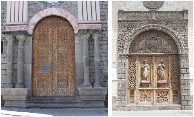 A moldura talhada em pedra de estilo barroco, que fazia parte do pórtico da igreja dos jesuítas, encontra-se atualmente na capela do Colégio El Oviedo, como mostra a fotografia à direita da Figura 5, localizado em uma rua por onde todos os dias passam centenas de estudantes. As colunas e as pedras que também compunham o pórtico, se encontram na entrada da capela do Colégio Diocesano Bilíngue, fotografia esquerda da Figura 5. Antigamente, com essas colunas, também estava a porta de madeira pertencente à igreja original. No entanto, com o passar do tempo a porta ficou deteriorada e foi retirada - o seu paradeiro atualmente é desconhecido. Observa-se também na fachada que as pedras para a construção foram retiradas dos prédios caídos durante o terremoto.