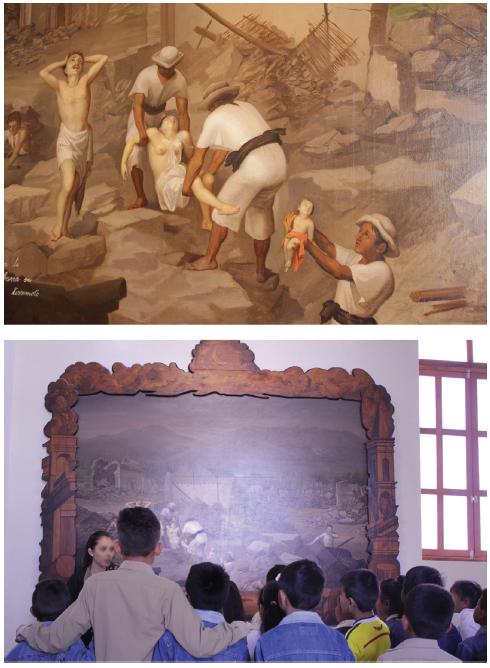 No dia da visita, se deparou com uma excursão de crianças, a fotografia mostra os estudantes aprendendo a História da cidade através da arte. Na mesma Figura 8 está a foto aproximada do dito quadro. A obra representa entre ruínas e escombros aos moradores socorrendo as pessoas soterradas, crianças levantadas dos escombros, expressões de dor pelos falecidos.
