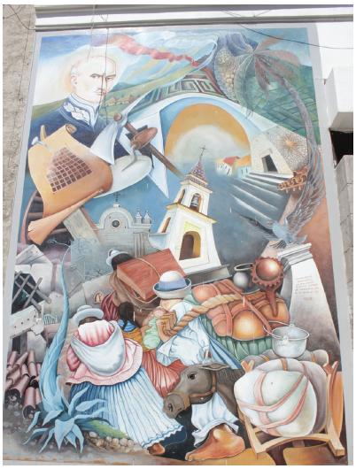 Existem também aqueles elementos plásticos mais recentes acerca do retorno à cidade, como se observa no mural localizado na fachada da Prefeitura de Ibarra, na frente da praça principal como mostra Figura 9. O mural foi elaborado por diferentes artistas. Podem ser reconhecidos pela assinatura: Suarez e Lumuico.