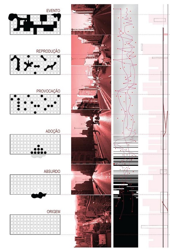 Ao partir dessas considerações, o metaprojeto em questão propõe uma reflexão que induza a perguntas como respostas a fim de descobrir a latência invisível de determinada situação, abordando fundamentos filosóficos da ordem complexa emergente e do processo de criação. Um dinamizador entre as forças top-down do projeto e as forças bottom-up dos processos emergentes, um filtro teórico entre a abstração e a concretude, emulando os conceitos de “absurdo”6 (como interrupção), “emergência”7 (como processo aberto) e “antifragilidade”8 (como um antídoto à obsolescência), a fim de revigorar a potência da urbanidade além de sua materialidade. Não se trata, pois, de buscar fórmulas a serem seguidas ou normatizar o processo de projeto, mas sim de entender, conscientemente, o que as forças externas podem contribuir ao vigor da pertinência da arquitetura, focado sobretudo, às condições de campo dos singulares artefatos que rompem condições preestabelecidas. Como em cenários onde os agregados componentes reúnem a racionalidade de um sistema qualquer - circulação, por exemplo -, e poética do cotidiano.
