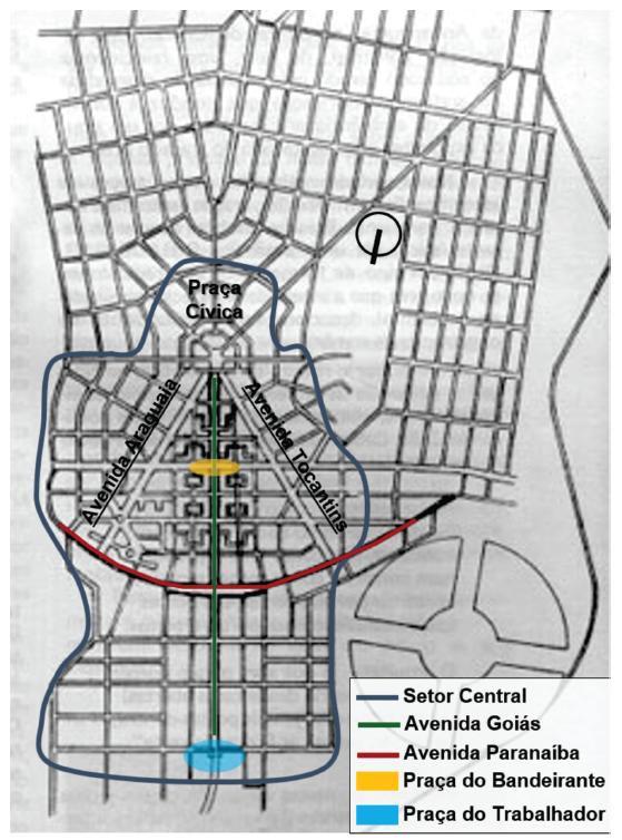 O caráter paisagístico monumental de centro urbano, presente em seu desenho, pode ser percebido, portanto, em outros pontos de atração urbana além da Praça Cívica e a Avenida Goiás, como: a Praça do Bandeirante, localizada no cruzamento da Avenida Goiás com a Avenida Anhanguera; o largo da Estação Ferroviária (atual Praça do Trabalhador) situada no final da Avenida Goiás, contrapondo-se à Praça Cívica no seu polo oposto, e a Avenida Paranaíba, projetada como um boulevard em forma de um grande arco ligando as três principais avenidas da cidade, evidenciada na Figura 1.