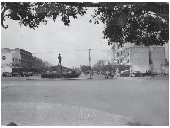 A partir da análise da vegetação, identificada nos registros fotográficos acima -aparentemente do mesmo porte -, dos modelos de veículos importados, característicos da década de 19507, da altura e do aparente estado de preservação dos edifícios, conclui-se que ambas fotografias pertencem a década de 1950.