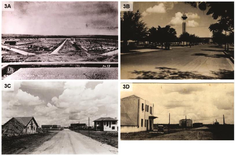 A Foto 3B, registro de 1945, enfoca o projeto urbano e paisagístico dado à Avenida Goiás. Nessa imagem, sacada 10 anos após a primeira, destaca-se a predominância do verde nos espaços públicos representativos da cidade e a presença de monumentos simbólicos de uma modernidade que tem hora e tempo, como o Relógio localizado nas imediações da Praça Cívica e criado a partir da estética déco, que na época traduz-se como “moderno”. Já na Foto 3C, que mostra a Avenida Tocantins em 1935, pode-se vislumbrar, ao fundo, alguns dos edifícios institucionais localizados na Praça Cívica, que revelam o foco da implantação da cidade, voltado para seu núcleo e depois para as vias. As fotografias 3C e 3D, apesar de registrarem, em sua composição formal, perspectivas e ângulos diferentes, possuem um mesmo “foco temático”, onde as primeiras casas construídas, nesta região da cidade, ficam em primeiro plano. Essas casas também tinham a conotação de modernidade. Elas “patenteavam” um novo modo de morar em relação à antiga capital, modo esse representado pela racionalização dos espaços e dos materiais construtivos - e sua relação com os então “novos espaços urbanos” -, bem como pelos recursos estéticos, ecléticos e déco, em geral utilizados por uma burguesia ascendente, no caso composta por profissionais liberais e funcionários técnicos/administrativos do, naquele momento, Estado Novo, que vieram ajudar a construir a cidade. Percebe-se também, em ambas imagens, a relação entre as dimensões exíguas dos edifícios administrativos, ao fundo, em relação estas residências, a poucos metros de distância.
