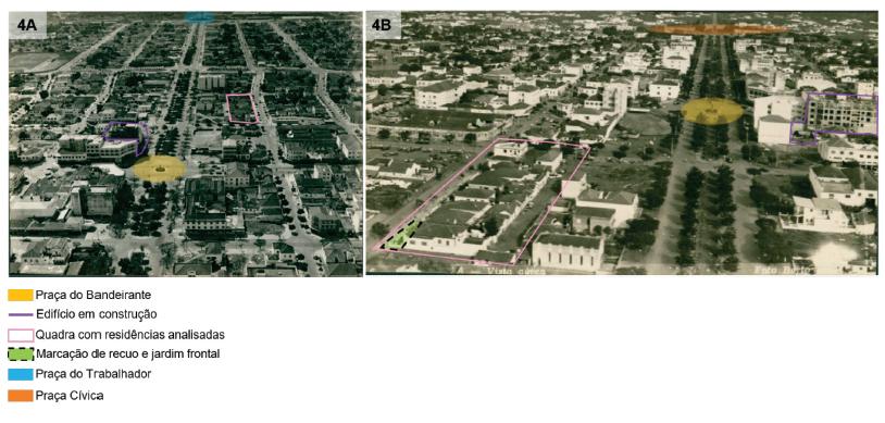 Sabe-se que o Estádio Pedro Ludovico Teixeira foi inaugurado no ano de 1941, portanto, a fotografia 4A foi registrada antes deste ano. Dito isso, há também um fator que aponta que a diferença temporal entre as duas imagens não é tão distante, uma vez que o edifício destacado em roxo aparece em construção nas duas imagens. Por estes motivos acredita-se que as imagens são registros da mesma década. Ademais, a fotografia 4B foi registrada e assinada por Sílvio Berto, fotógrafo pioneiro da capital, que produziu diversas vistas urbanas da cidade de 1936 a 1973 (SILVA, 2012). Portanto, pode-se concluir que a fotografia 4B foi realizada após 1936.