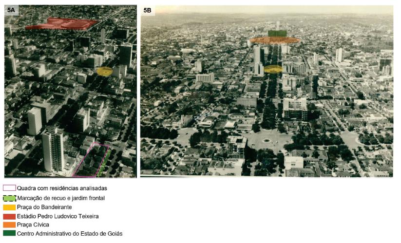 As fotografias a seguir, 5A e 5B, agrupadas pela Figura 5 também são fotografias aéreas, onde a Foto 5A retrata a Avenida Goiás em primeiro plano, a Praça do Bandeirante no centro da imagem e o Estádio Olímpico - que fica nas confluências da Avenida Paranaíba -, ao fundo. Já a foto 5B retrata em primeiro plano o cruzamento de Avenida Goiás com a Paranaíba, com a Praça do Bandeirante ao meio e a Praça Cívica, ao fundo. Vale ressaltar que, na época da foto, a Avenida Paranaíba fazia a divisa entre o Setor Central e o Norte Ferroviário, que compreendia a zona industrial e operária da cidade e uma zona destinada ao comércio pesado. O atual Setor Central é composto por esses dois setores, que compõem o núcleo inicial da cidade.
