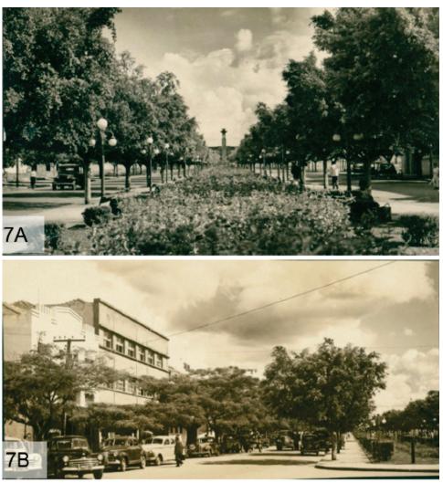 Existem, portanto, duas diferenças básicas entre as fotos: a Foto 7A é registrada do ponto de vista do observador, imerso no espaço do canteiro central e a segunda Foto (7B) é tirada um pouco acima desse ponto, onde há certo distanciamento que não permite visualizar sua espacialidade. A primeira imagem está centralizada no eixo de composição do espaço, a segunda está descentralizada, aparecendo mais em destaque os edifícios que conformam os limites da Avenida. O tema das imagens é, portanto, diferente. Na primeira (7A) é o jardim, a vegetação, o monumento; na segunda imagem (7B) é a rua, os elementos de convívio urbano, as pessoas, os veículos e os edifícios.