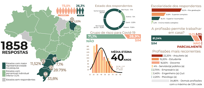 Ainda conforme a Figura 1, é possível conhecer outras características do público respondente da pesquisa. As profissões que apareceram com maior frequência foram arquitetos, com 22,2% do total; estudantes (15,2%); docentes (16,5%); servidores públicos (4%); empresários (2,7%); aposentados e engenheiros civis (ambos 2,4%); psicólogos (2,2%) e administradores (2,1%). As demais profissões eram exercidas por 1,5% do total de respondentes ou menos. Dentre os respondentes, quando questionados se suas profissões permitiam que eles trabalhassem em casa durante o período de isolamento social, 81,24% responderam sim; 15,1% responderam não; 5,9% optaram por parcialmente e 0,9% por não se aplica.