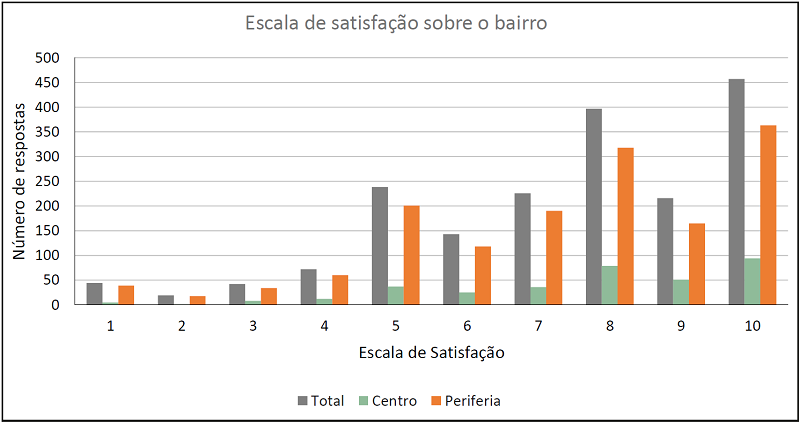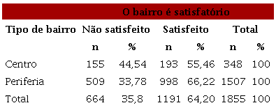 De fato, o teste X² revelou haver evidências de uma associação entre o tipo de bairro e a satisfação ( X²=14,25; gl=1; p<0,001), apesar de se observar um efeito pequeno de uma variável em relação à outra (Coeficiente de Contingência de Pearson=0,09). Esse resultado pode indicar que, mesmo distantes de equipamentos típicos das centralidades, os bairros periféricos podem também oferecer elementos importantes para a qualidade de vida, fomentando a percepção de que necessidades e aspirações são satisfeitas no e pelo lugar.