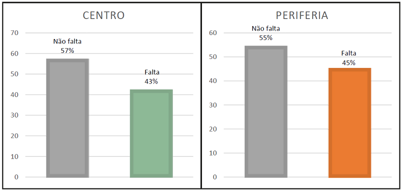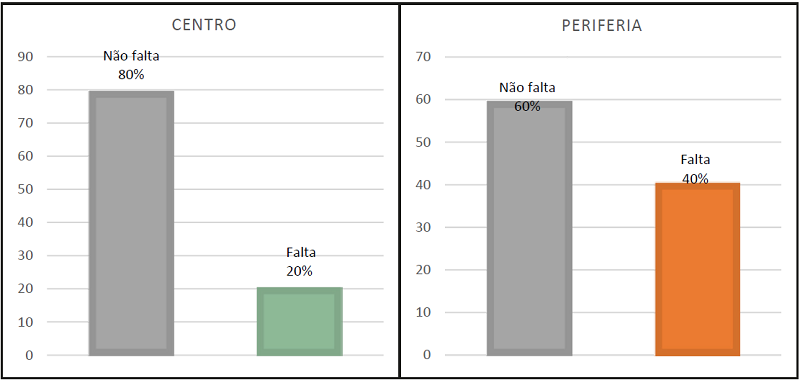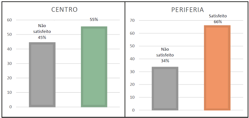 Passando-se às análises relacionais entre a satisfação com a infraestrutura do bairro e o tipo de bairro de moradia, observou-se que a ocorrência de moradores satisfeitos (ou seja, que não sentem falta de algo) foi expressiva tanto na região central quanto na região periférica. Ainda que a diferença de avaliação de satisfação não seja expressiva para esse perfil de respondentes, é revelador que os moradores de bairros periféricos (66,22%) tenham se declarado mais satisfeitos com o bairro do que os moradores do centro (55,46%). A Tabela 1 e a Figura 3 mostram os resultados.