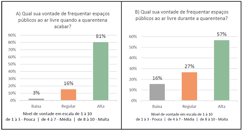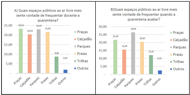 Este estudo também indicou que os parques (69,48%), praias (53,88%) e praças (57,21%) continuarão sendo os espaços ao ar livre mais requisitados após findada a quarentena, seguidos do calçadão (41,17%). Vale ressaltar que houve um aumento do número de pessoas que manifestaram vontade de frequentar trilhas após a pandemia, passando para 32,13%. Desses respondentes, 3,98% não gostariam de frequentar qualquer espaço, mesmo após o período de isolamento; um aumento de 0,64% em relação ao período pré-pandemia.