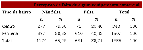 O teste X² revelou haver evidências de uma associação entre o tipo de bairro e a satisfação dos residentes com os equipamentos comerciais existentes ( X²=49,04; gl=1; p<0,001). Nessa análise, também o Coeficiente de Contingência de Pearson (C) indicou um efeito pequeno de uma variável em relação à outra (C=0,16). De fato, pode-se esperar que regiões centrais sejam mais fartas em relação a equipamentos de comércio (dadas as características próprias das áreas de centralidade) e que, em contrapartida, esses sejam mais escassos em zonas periféricas.