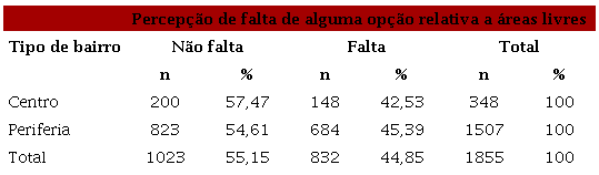 Relativamente às áreas livres do bairro, 832 (44,85%) respondentes declararam sentir falta desses espaços. Cruzando os dados de percepção de falta de espaços livres entre residentes do centro (42,53%) e da periferia (45,39%), nota-se que o nível de satisfação é muito parecido. Essas informações constam na Tabela 3 e na Figura 5. O teste X² revelou não haver evidências de uma associação entre o tipo de bairro e o nível de satisfação com a existência de áreas livres ( X²=0,93; gl=1; p=0,334). Para essa amostra em específico, refuta-se a ideia de que necessariamente há discrepância entre a disponibilidade de espaços livres no centro e na periferia. A pesquisa leva à reflexão de que alguns bairros periféricos podem ser tanto quanto ou mais providos de espaços livres do que o centro, portanto deve-se ter cuidado com generalizações, cabendo um estudo da realidade e das necessidades de cada bairro das cidades. Também esse grau de satisfação pode estar associado com a disponibilidade de espaços livres nas residências, sendo que nesta pesquisa 64,61% dos respondentes afirmaram possuir esse tipo de espaço em suas casas.