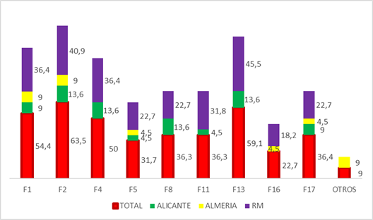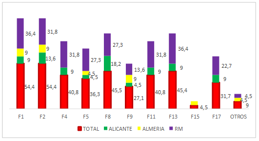 Provincia de Alicante: orientación familiar, necesidades educativas especiales, trastornos de la conducta, dificultades de aprendizaje, absentismo y abandono escolar y, por último, mediación escolar, todas seleccionadas por las personas participantes;