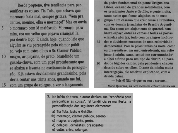 A questão apresentada, a nosso ver, enquadra-se nesse Grupo, posto que solicita ao estudante que apenas busque os elementos personificados ditos no texto; que é justamente o tema e a explicação que a crônica traz, principalmente em suas primeiras 10 linhas. Feita a leitura, identificados os elementos no texto, basta assinalar a alternativa correta. Tal procedimento dá ênfase à língua como sistema de códigos e à ideia de que, para compreendê-la, basta decodificar seus elementos. Nesse enfoque, conforme Azevedo (2010), o significado encontra-se depositado nas palavras ou nos signos. Por conseguinte, o texto é considerado um fim em si mesmo, e a leitura encontra sua plena realização no reconhecimento das palavras, da estrutura e do sentido dado pelo texto. Dessa maneira, a interpretação “é uma atividade que exige do leitor apenas o foco no texto, em sua linearidade, uma vez que ‘tudo está dito no dito’.” (AZEVEDO, 2010, p. 22).