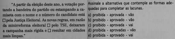 Pelas características das alternativas apresentadas, pode-se inferir tratar-se de uma típica questão de completar lacunas, com uma sequência de palavras de acordo com a norma culta da Língua Portuguesa. Entre as cinco alternativas, o estudante precisa encontrar aquela em que as três palavras se encaixem, sintática e morfologicamente, nas lacunas do texto. Marcuschi (2008, p. 271) considera esse tipo de questão “uma atividade mecânica de transcrição de palavras”, uma vez que exige do leitor apenas conhecimento gramatical. A partir das alternativas dadas, como falante nativo da Língua Portuguesa, ao leitor basta decidir aquela em que as palavras se enquadram melhor ao contexto frasal.