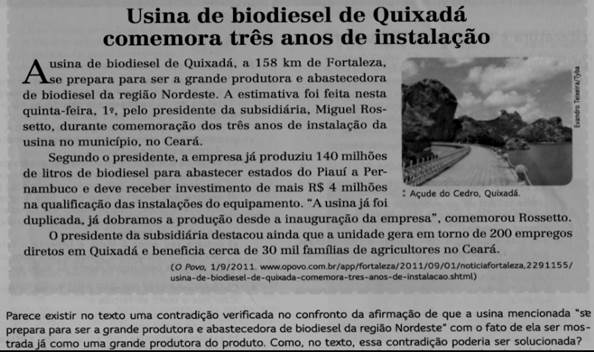 Na atividade em destaque, evidenciamos que o aluno precisa identificar o que a questão deseja problematizar com a interrogação Como, no texto, essa contradição poderia ser solucionada?, a partir do termo em destaque no enunciado: se prepara para ser a grande produtora e abastecedora de biodiesel da região Nordeste. Ele deve ser capaz de perceber a contradição existente de acordo com a resposta esperada por Cereja e Magalhães (2013). Para os autores, o problema encontra-se na palavra grande, assim, o aluno pode fazer a substituição pelo termo principal. Entretanto, cabe ressaltar que grande, a partir do Dicionário de Sinônimos (SINÔNIMO..., 2017), possui 72 sinônimos e nove sentidos. Dessa forma, além de terem problema para a validação da resposta correta, os envolvidos na relação leitora, terão pouco estímulo para desenvolverem associações críticas com relação ao conteúdo disposto no texto. Isso porque a condição dialógica está posta em segundo plano. Por conta disso, recorremos a Freire (2005), para quem a dialogicidade se apresenta como fenômeno humano, isto é, torna-se relevante nas relações interpessoais, bem como por meio da leitura do texto. Em outras palavras, o diálogo é uma exigência existencial, seja aqui entre o texto e o leitor, seja entre as pessoas e suas relações sociais em geral.
