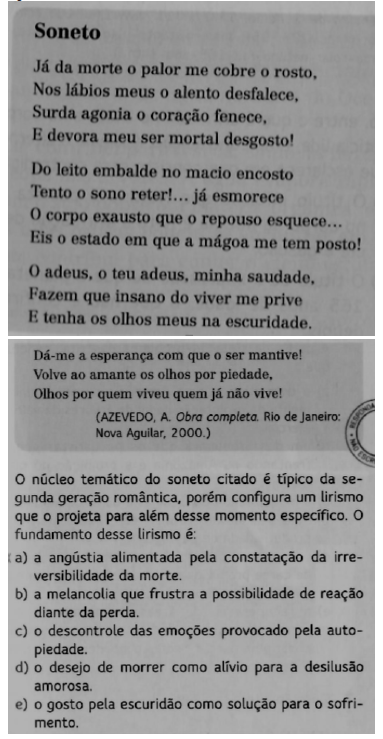 Pelo enunciado, com base no poema, o leitor necessita estar atento à estrutura do texto, reconhecendo prontamente as características do soneto, além de retomar, a partir de seus conhecimentos prévios, as características da segunda geração romântica. Logo, para efetivação da leitura, é necessário, simultaneamente, que o leitor, além de manejar as habilidades de decodificação, aporte-se de seus saberes e experiências prévias. A resolução da questão em apreço exige que o leitor recorra ao conceito e características da vertente romântica da literatura e das artes em geral, bem como perceba e se envolva com as emoções desencadeadas a partir de temas como morte e sofrimento. Abre, ainda, possibilidade de ir mais além, visto que as alternativas apresentadas exigem conexões e reflexões com o poema para que se possa caracterizar o lirismo do soneto. Mais ainda, a questão pode possibilitar ao estudante pensar na história do homem e do próprio poeta Álvares de Azevedo.