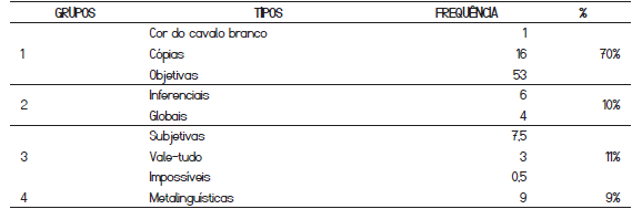 Na análise das questões de interpretação propostas na Coleção, identificamos apenas três representantes do Grupo das subjetivas, vale-tudo e impossíveis (1,7%). Quantidade bem inferior à identificada por Marcuschi (2008), que contabilizou 11% delas em sua pesquisa.