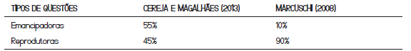 Assim, como síntese das 178 questões analisadas em Cereja e Magalhães (2013), construímos a Tabela 2, comparando os resultados de nosso estudo e os de Marcuschi (2008). Na referida Tabela, reagrupamos os quatro grupos de questões de interpretação em apenas dois: o das emancipadoras (possibilidades) e o das reprodutoras, como segue: