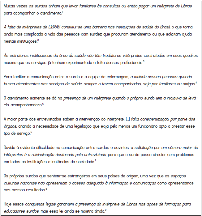 Nos estudos que compõem o corpus desta pesquisa foi possível identificar o interesse de diferentes áreas sobre a atuação de tradutores/intérpretes do Língua Brasileira de Sinais/Língua Portuguesa. As pesquisas de Casali (2012), Chaveiro e Barbosa (2005), Pereira (2014), Machado et al. (2013), Neves, Felipe e Nunes (2016) são direcionados aos serviços de saúde. Dias (2013) realizou sua pesquisa nos órgãos públicos; Santos (2008) em diferentes espaços do Município de Santa Maria, RS; Souza et al. (2016) enfocaram no cenário do trânsito; além de Oliveira (2015) e Silva (2015) direcionarem a pesquisa para os museus e centros culturais. Esses estudos evidenciam a falta dos tradutores/intérpretes de Língua Brasileira de Sinais/Língua Portuguesa atuando nos espaços identificados. A ausência desses profissionais faz com que os surdos precisem procurar outras pessoas (família, amigos, etc.) ou tradutores/intérpretes de outras áreas para auxiliarem na comunicação. No Quadro 1 descrevemos esse cenário a partir de excertos das pesquisas: