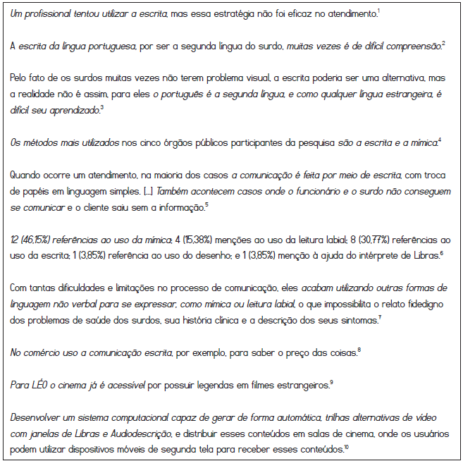 O conjunto de excertos, agrupados no quadro acima, permite-nos identificar três estratégias principais para a comunicação entre surdos e ouvintes, dada a ausência de tradutores/intérpretes: escrita, mímica e a leitura labial. Os estudos de Casali (2012), Chaveiro e Barbosa (2005), Lopez (2016) e Neves, Felipe e Nunes (2016), que realizaram entrevistas com pessoas surdas, concluem que as estratégias utilizadas pelos funcionários nos espaços identificados não constituem um caminho ideal para uma boa comunicação, gerando uma barreira no atendimento dessas pessoas, pois a Libras, considerada a primeira língua dos surdos brasileiros, é raramente utilizada pelos ouvintes para a comunicação. Assim, as condições de acesso dos surdos aos distintos espaços sociais são limitadas pelas barreiras linguísticas. Nessa esteira, alguns estudos ressaltam que a aprendizagem da Língua Portuguesa como segunda língua pode ser difícil para o surdo, pois constitui outra modalidade linguística, diferente da Libras, como destacam os estudos de Casali (2012) e Chaveiro e Barbosa (2005). No entanto, mesmo que as línguas orais e de sinais se constituam a partir de canais diferentes de percepção e emissão de signos linguísticos, com as estratégias adequadas, os surdos são capazes de aprender ambas as línguas.