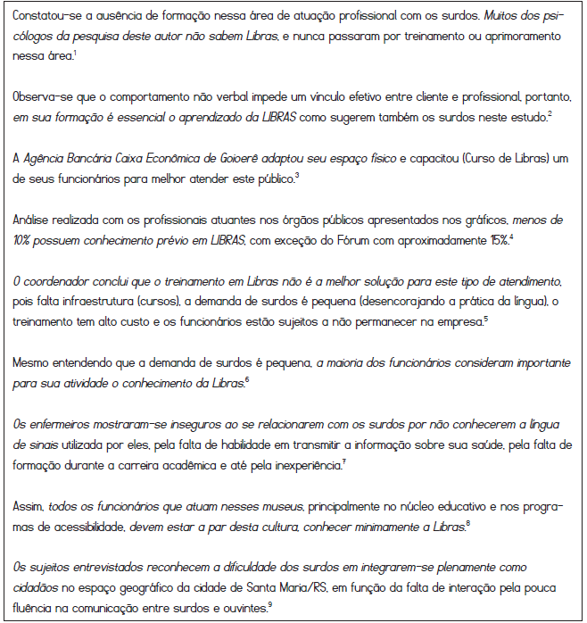 A partir desse frágil conjunto de alternativas utilizadas para a comunicação entre surdos e ouvintes, e dada a sua ineficiência na promoção de uma comunicação eficaz, passamos a buscar, nos estudos analisados, a existência ou não de capacitação em Libras para os profissionais que trabalham nos espaços identificados e a importância do uso dessa língua para ouvintes e surdos. O Quadro 3 apresenta os dados retirados dos estudos: