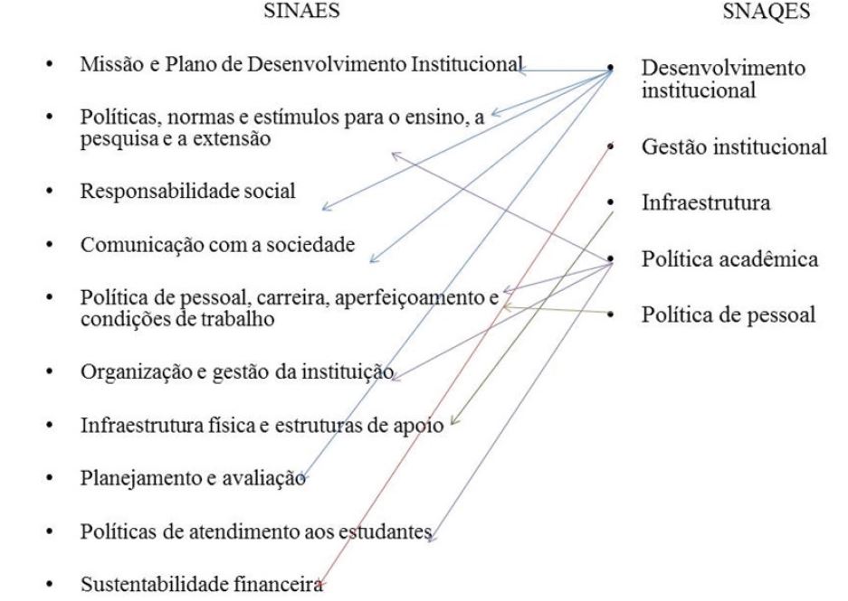 Assim, analisando as dimensões e os indicadores que constituem os sistemas de avaliação do Sinaes e do Snaqes, observamos grande correspondência e similaridade, conforme destacamos na sequência:
