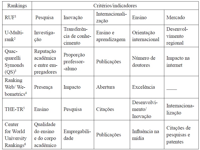 O Quadro 1 é um demonstrativo dos critérios utilizados nas avaliações de universidades. Não levamos em consideração os resultados dos rankings, mas os indicadores e a frequência com que aparecem no contexto das metodologias de avaliação. Os critérios analisados são indicadores globais utilizados pelos seguintes rankings: Ruf, U-Multirank, Quacquarelli Symonds, Ranking Web, THE-TR e Center for World University Rankings.