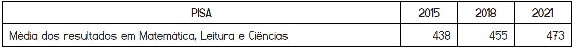 O mesmo PNE (BRASIL, 2014), na estratégia 7.11 da meta 7, apresenta o objetivo almejado no Pisa: “melhorar o desempenho dos alunos da educação básica nas avaliações da aprendizagem no Programa Internacional de Avaliação de Estudantes - PISA, tomado como instrumento externo de referência, internacionalmente reconhecido, de acordo com as seguintes projeções:”