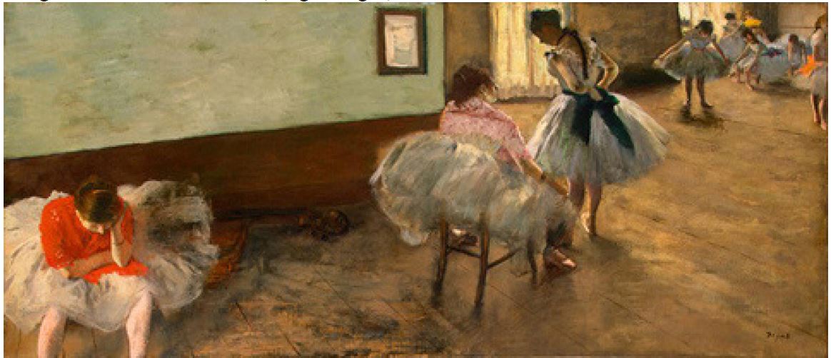 Na Imagem 1, reproduzimos uma das pinturas de Degas. Aqui, as bailarinas são retratadas em uma aula de balé, o que poderia gerar a expectativa da visualização de meninas executando movimentos idênticos e simultâneos. Diferente disso, o que o pintor oferece não guarda qualquer relação com esta imagem canônica. Em seu quadro, vemos as meninas pintadas em tons pastéis, característica da obra de Degas ao pintar bailarinas, e elas se encontram em uma sala onde são ensaiados passos de balé. Na sala, há duas janelas com leves cortinas brancas, por onde é permitida a entrada de luz, mas que não revela ao mundo o que fazem as bailarinas. Ao chão, provisoriamente esquecido de sua função, há um violoncelo desfrutando deste momento em que não lhe é exigida a repetição exaustiva dos mesmos acordes. Uma das meninas encontra-se sentada em uma cadeira, e é possível ver seus pés separados, voltados para as laterais de seu corpo, em posição de dança. Para marcar seu status de bailarinas, todas trajam vaporosas saias, prendem os cabelos em impecáveis coques e usam suas sapatilhas de cetim. Em contradição a estes marcos regulatórios, o "enquadramento" da obra revela uma marca de seu autor, a da recusa pelo "enquadramento". Não há um centro, não há uma perspectiva, não há uma estética hegemônica. A impressão é de que a tela foi pintada a partir de um dos poucos momentos de afrouxamento da técnica, pois as meninas são retratadas fora de qualquer linearidade ou ordenamento.