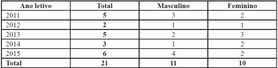 Buscando entender como os estudantes vivem este processo de transição - ritos de passagem e inclusão - entre a escola rural e a escola da cidade, no que se refere às expectativas que marcam esse momento, mapeamos o quantitativo de estudantes egressos da escola de classe multisseriada parceira no período de 2011 a 2015. O Quadro 1 explicita o quantitativo de alunos matriculados no 5º ano, no período referido, perfazendo um total de 21 alunos egressos.