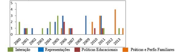 Observam-se as quatro cores representando cada tendência e o seu movimento na produção do conhecimento sobre a relação escola e família. Na primeira metade, que corresponde aos anos 2000 a 2006, registra-se a maior produção das tendências interação e representações. No final desse período, já encontramos dois trabalhos que representam as tendências políticas educacionais e práticas e perfis familiares. Porém, é na segunda metade, entre 2007 e 2013, que essas tendências se apresentam com o número maior de trabalhos, principalmente práticas e perfis familiares.