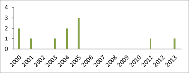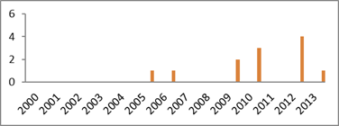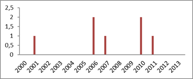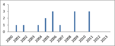 A tendência políticas educacionais é a que representa a menor produção dentro dos estudos sobre a relação família e escola. Seu movimento se fortalece após o ano 2006 e destaca-se em dois períodos, nos anos 2006/2007 e 2010/2011, como se observa no Gráfico 4, a seguir.