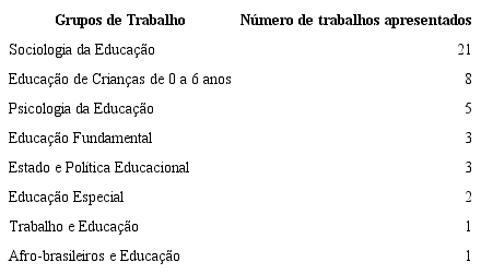 É importante reconhecer como estão representadas as diferentes áreas. Observamos que a maioria dos trabalhos (65,9%) foi apresentada nos Grupos de Trabalho da Sociologia da Educação e da Educação de Crianças de 0 a 6 anos.