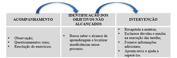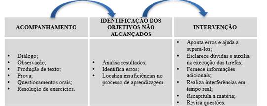 Para ampliar a compreensão relativamente à forma como as professoras realizaram a avaliação da aprendizagem valendo-se dos erros, foi elaborado um quadro representativo, a partir dos elementos que caracterizam as práticas avaliativas de P1, P2 e P3: acompanhamento, identificação dos objetivos não alcançados e intervenção (Quadro 9).