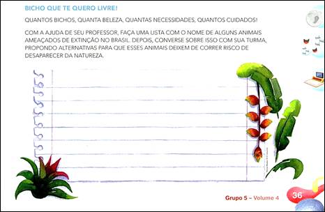 (116) CA: Ponha mais? (117) PROFESSORA: A baleia, existe uma baleia que também está em extinção: baleia-franca do sul, também está em extinção. [Os alunos falam todos juntos] (118) LU: Eu achei que ela ia falar baleia-azul. [Os alunos falam todos juntos, não sendo possível a compreensão] (119) PROFESSORA: Atenção! Oh, xiiiii, pronto! [A professora lê o enunciado da atividade] Bicho que te quero livre. Quantos bichos, quanta beleza, quantas necessidades e quantos cuidados! Com a ajuda do seu professor, faça uma lista de nomes de animais, bichos ameaçados em extinção no Brasil. [A professora mostra a lista no quadro] Então, oh, nessa página 36 do livro, tem um lugarzinho aqui bem legal. E, olha, o que você vai fazer? Você vai copiar o nome desses cinco bichos aqui, cada um desses em uma linha. Você vai abrir o livro na página. [A professora faz um círculo no quadro e dentro dele coloca o número 36] (120) LA: 26. (121) PROFESSORA: Não! (122) KW: 36. Tia, 36. (123) PROFESSORA: 36. Oh, você vai abrir o livro na página 36 e vai copiar cada nome em uma linha. [A professora distribui as apostilas]
