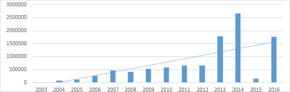 No que se refere aos gastos para a manutenção da parceria, considerando-se o ano de implementação dos programas adquiridos por meio de contratos nesse mesmo intervalo de tempo, observa-se um crescimento dos repasses, com destaque para os anos 2014 e 2016, e isoladas baixas, tal qual demonstra o Gráfico 2.