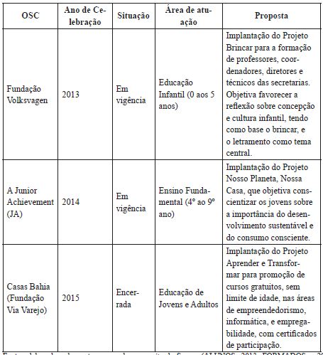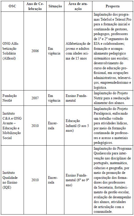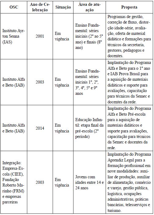 As parcerias firmadas entre a Semec e as OSC nos anos 2001 a 2015 contabilizam 11, sendo duas encerradas e nove em vigência. Para a Educação Infantil, são direcionados 27,2% dos conveniamentos; para o Ensino Fundamental, 45,4%; e para a Educação de Jovens e Adultos (EJA), 27,2%. Como se pode observar, a maior parte das parcerias são destinadas ao Ensino Fundamental.