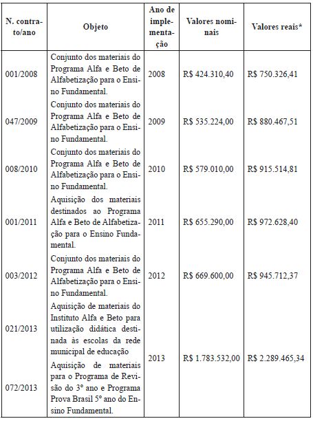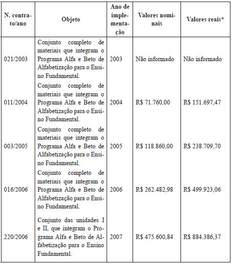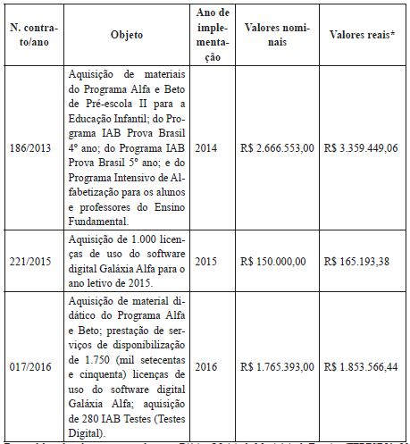Os dados apresentados no Quadro 2 mostram que, no decorrer de 14 anos, entre 2003 e 2016, foram assinados 15 contratos para a aquisição de diversos programas do IAB, com destaque para o Programa Alfa e Beto. O sistema de apostilamento fica explícito na maioria dos contratos, inicialmente para o Ensino Fundamental e, posteriormente, para a Educação Infantil. Ademais, licenças para uso de software, programa de apoio para a preparação de alunos para os testes em larga escala, bem como a aquisição do IAB Testes Digital para a avaliação de alunos da rede de ensino seguem desde 2013.